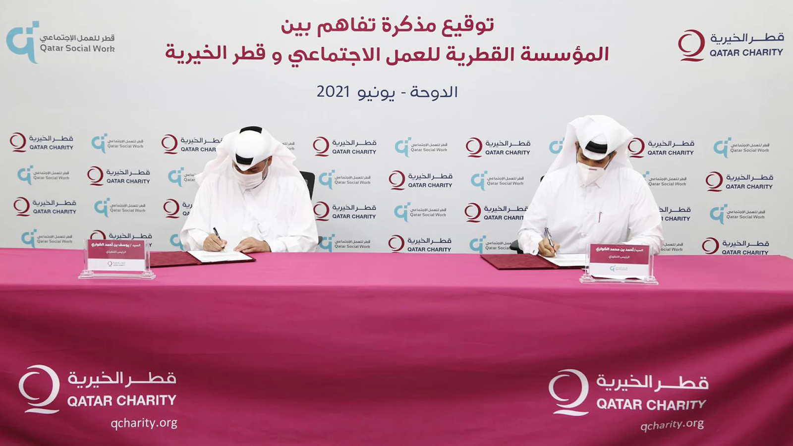 قد وقع على مذكرة التفاهم السيد يوسف بن أحمد الكواري الرئيس التنفيذي لقطر الخيرية والسيد أحمد بن محمد الكواري، الرئيس التنفيذي للمؤسسة القطرية للعمل الاجتماعي، بحضور عدد من المسؤولين في المؤسستين، إضافة إلى عدد من الإعلاميين وممثلي مختلف وسائل الإعلام.